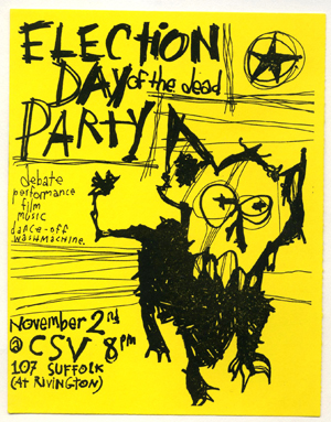 In 2004, the election day, which would eventually bring us four more years under the Bush regime, happened to fall on the Mexican Día de los Muertos. A themed gallery only seemed fitting: events included, but were not limited to a drawing debate by Noah Post and Gregory MacAvoy, as well as a drum debate, by Phil Moffa and Steve Brant. Washin Machine presented a video debate and Jonathan Phelps debuted his film, "Black and White and Red All Over."